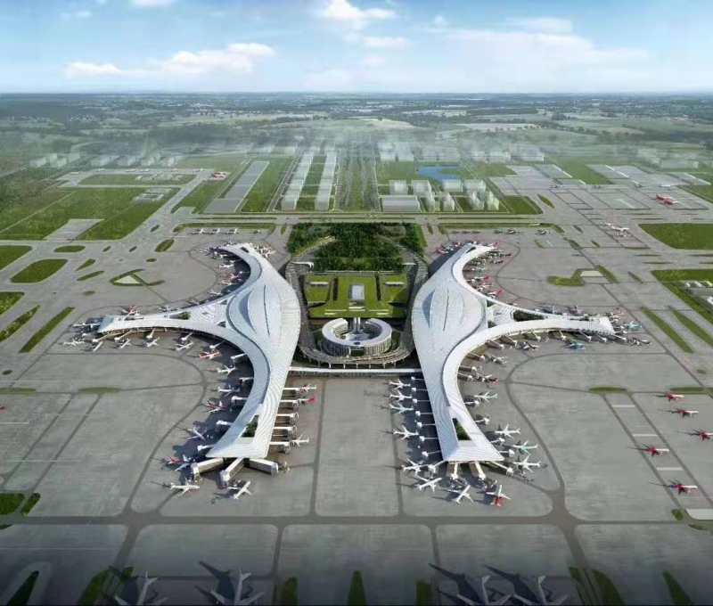 成都天府國際機場一期工程飛行區等級為4F,建設“兩縱一橫”共3條跑道、60萬平方米的航站樓、246個停機位以及相應的空管工程、供油工程、航空公司基地工程等設施。