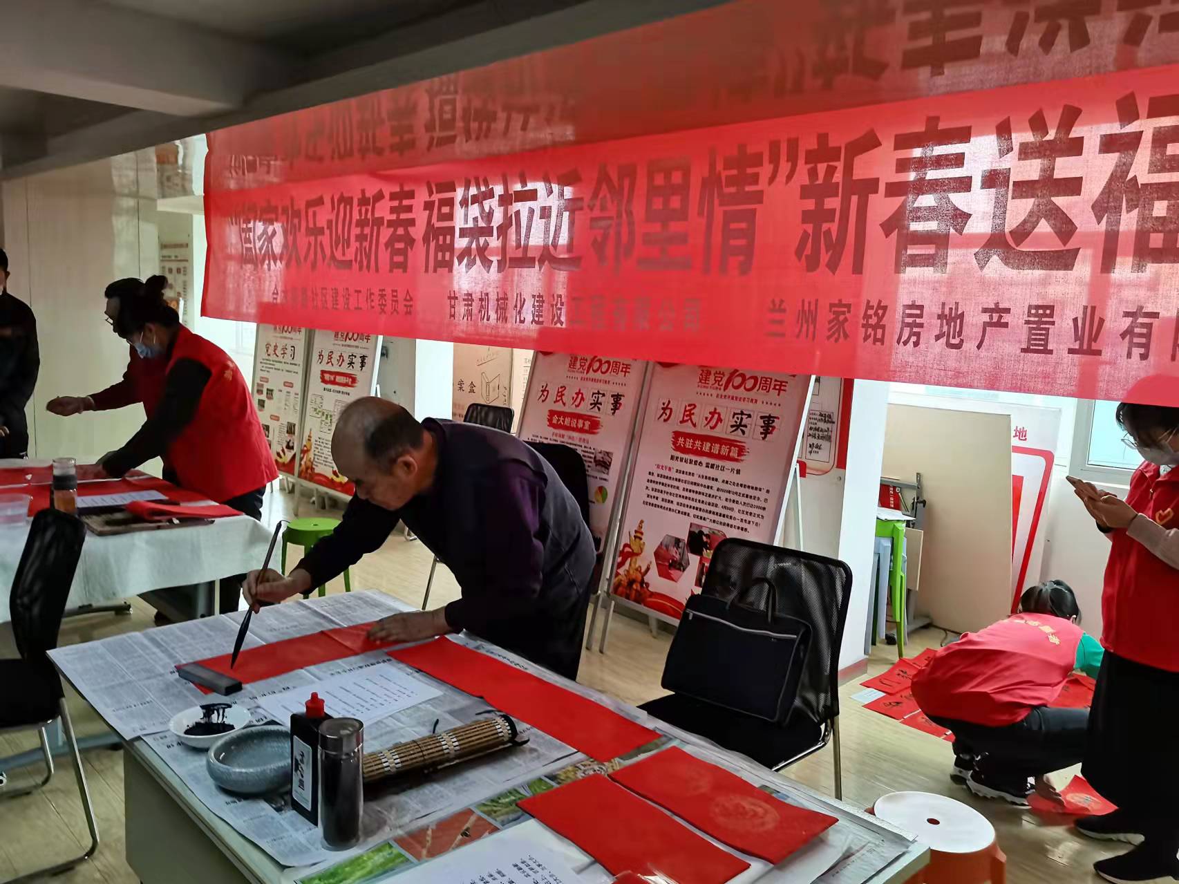 書法有行、隸、草等多種書法體,大家相互交流,相互學習。書法愛好者們將一副副飄著墨香的“?!弊炙偷骄用袷种?,同時也把祝福和溫暖送到每位居民的心坎上。