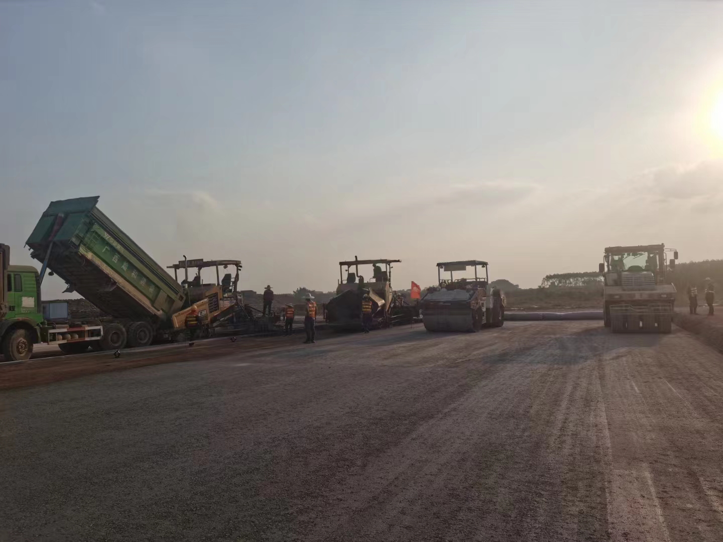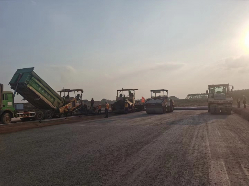 11月28日,隨著第一車水泥穩定砂礫混合料倒入攤鋪機,攤鋪機緩緩啟動,標志著由我司承建的南寧吳圩機場改擴建工程飛行區場道工程(四標段)水穩基層試驗段施工正式開始。