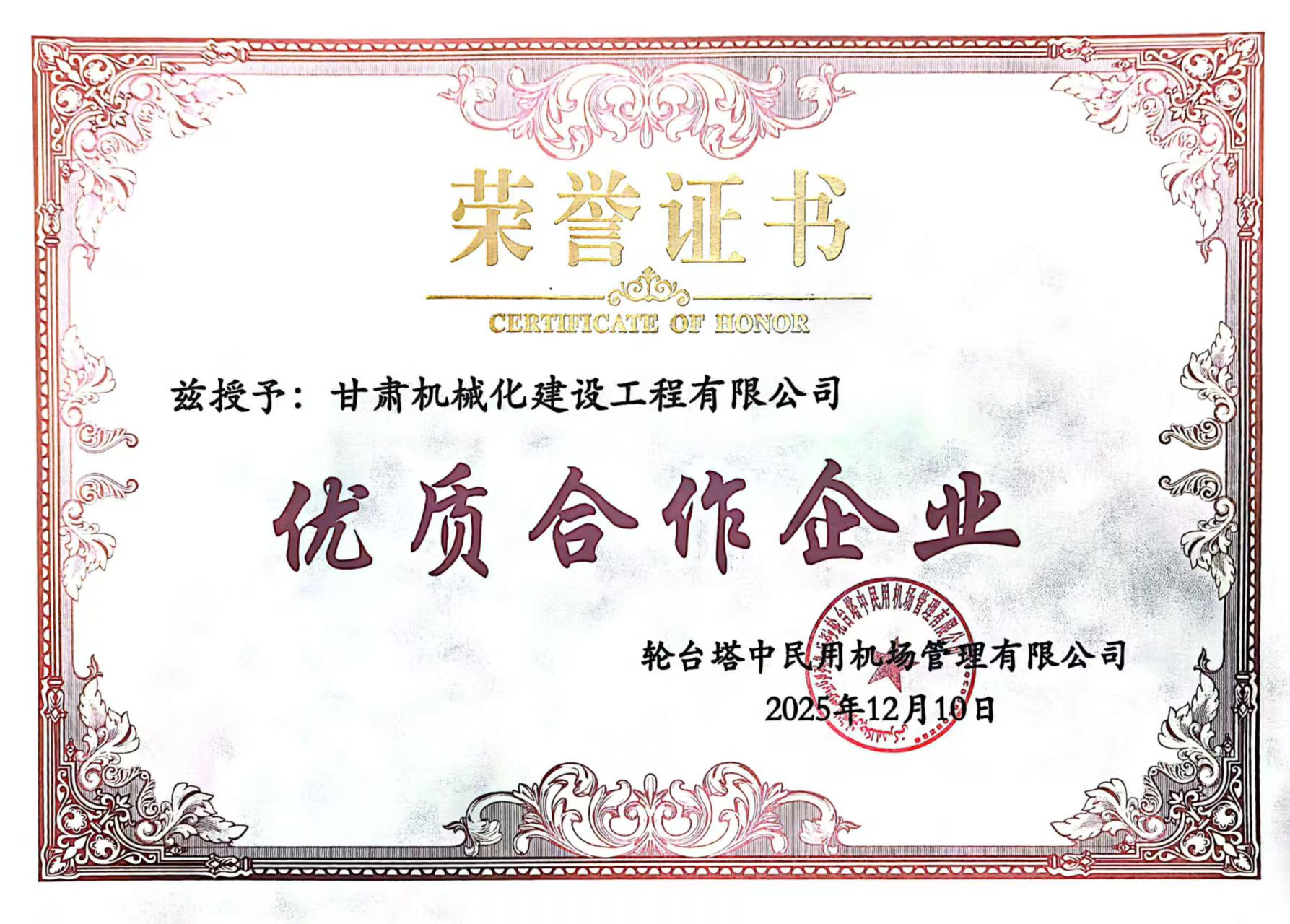 近日,新疆輪臺機場項目業主單位正式發布表彰決定,對項目建設期間履約盡責、實績突出的合作方及個人予以通報嘉獎,我司憑借扎實的工程履約能力與優質服務獲評“優質合作企業”,項目負責人同步斬獲“優秀項目經理”稱號,實現集體與個人榮譽雙豐收,彰顯業主單位對我司項目建設工作的高度認可。